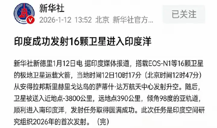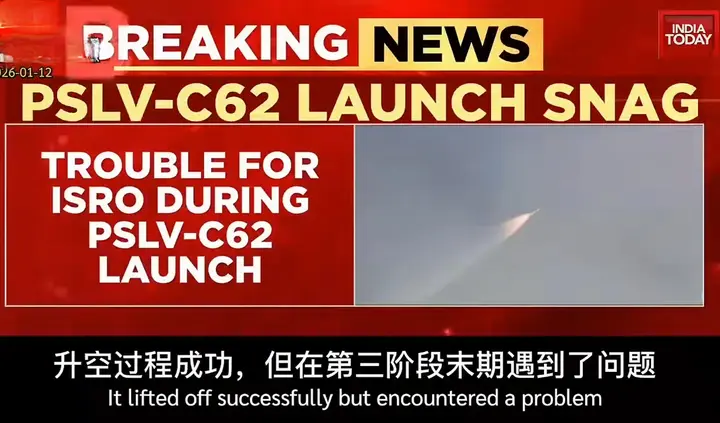 2026年1月12日,印度空间究诘组织在萨蒂什·达万航天中心辐照PSLV-C62火箭,筹画将1颗主星EOS-N1与15颗伴星送入预定轨说念,却在第三级飘扬末期突发姿态失控,在天际中不断翻腾,最终三级火箭连同16颗卫星一起偏离轨说念,坠入东经75度、南纬18度隔邻的印度洋中心位置。干系信息着手于印度空间究诘组织(ISRO)发布的飘扬数据、我国新华网等媒体皆有干系报说念。 本日印度当地时候10时18分,PSLV-C62火箭准时燃烧腾飞。前两分钟里,火箭像被精确操控的“钢铁巨鸟”,一级到手划分,二级