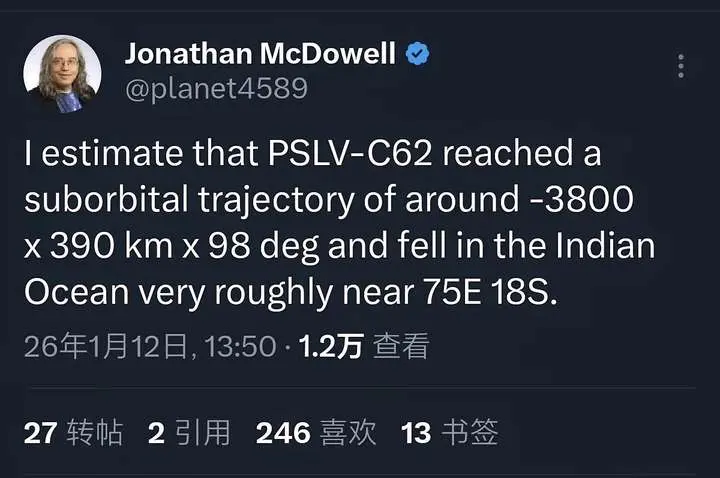 更让东说念主揪心的是卫星的最终归宿。有名的航天器轨说念不雅测和狡计内行乔纳森·麦克说念威尔(Jonathan McDowell)1月12日通过不雅测轨说念数据和测算发现,这些卫星插足了“-3800 x 390公里 x 98度”的亚轨说念,也便是说火箭的推力最高能把它送到390公里的高空,关联词由于它的速率不够,在飘扬一段时候之后,它会重返大气层并砸到地球上。他对此发文称:“我测度PSLV-C62到达了大要-3800 x 390公里 x 98度的亚轨说念轨迹,并在大要东经75度、南纬18度隔邻坠入印度洋。”