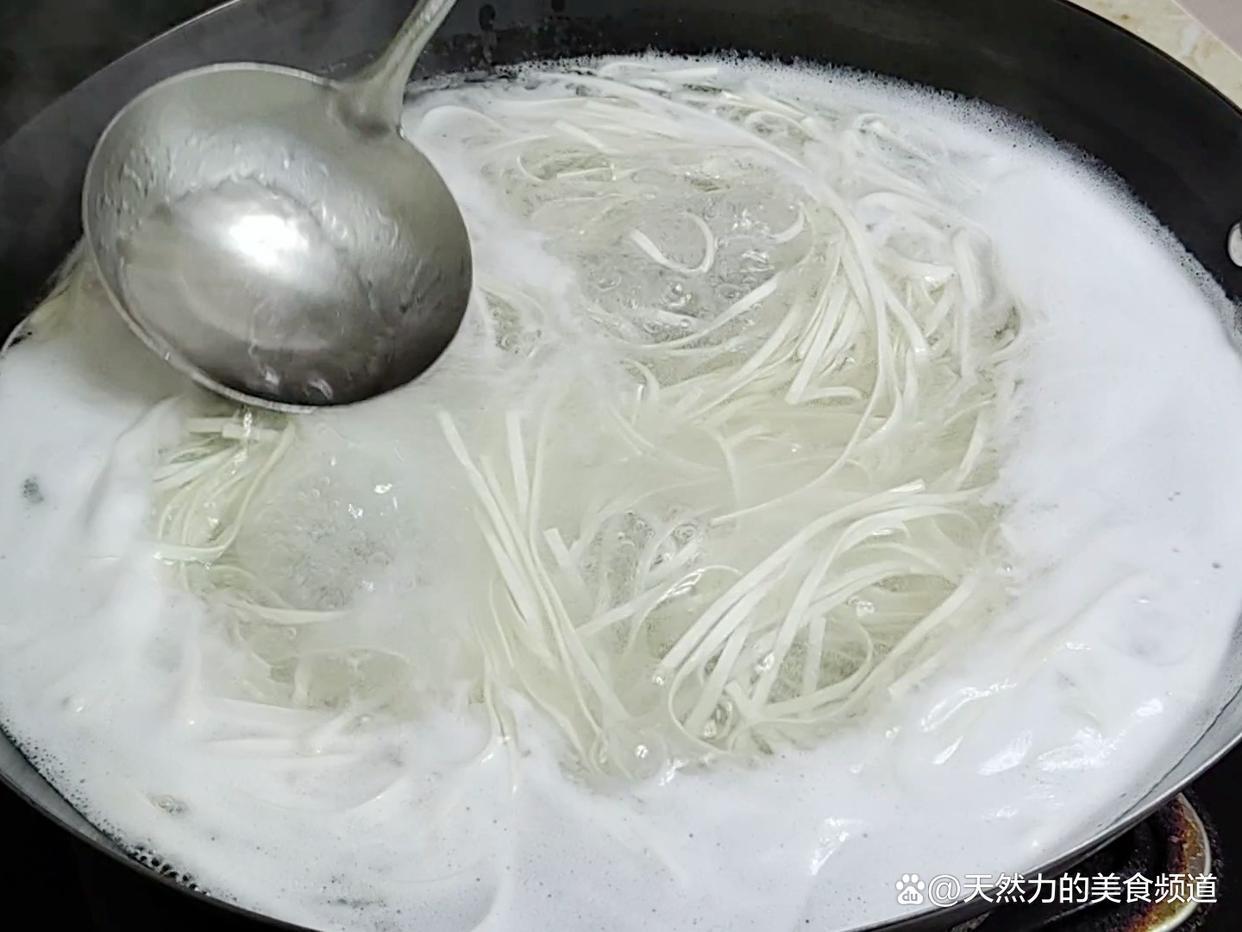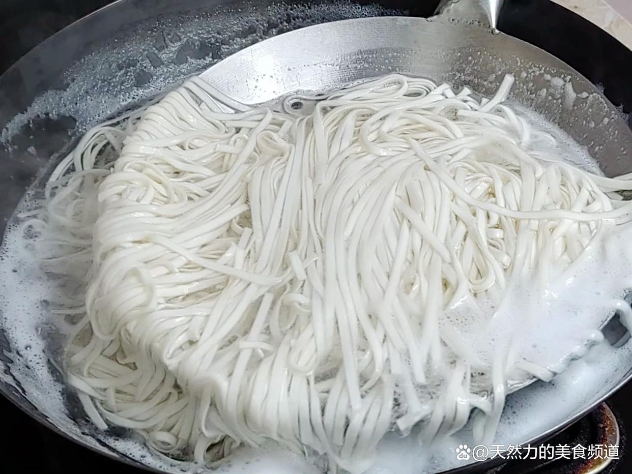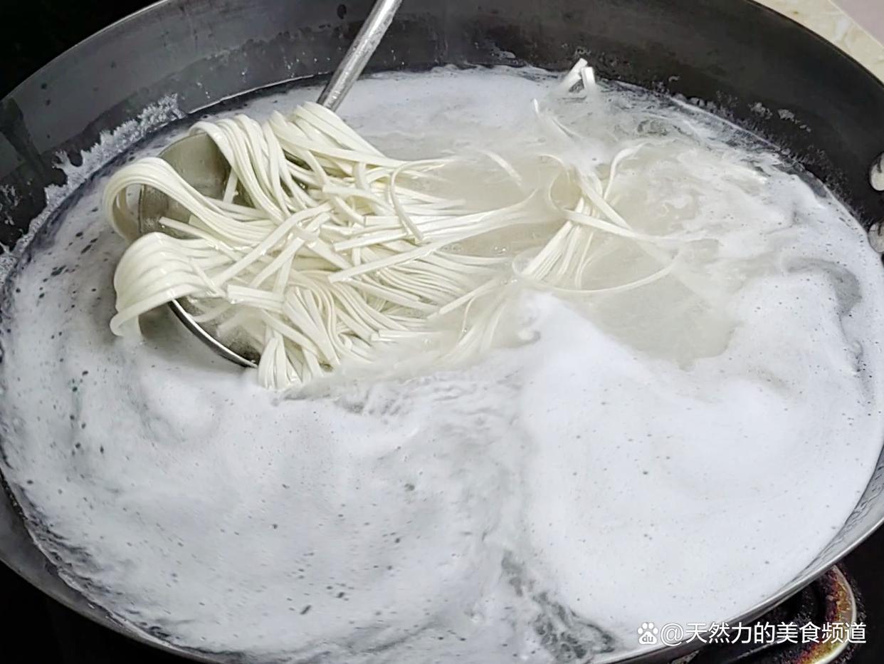 老爷子教我:煮干面条,要等锅底冒小泡、锅边响起来的本事下锅。这本事水温野蛮七八十度,面条下去有个缓冲,缓慢招揽水分,等水皆备烧开了,它内部也基本透了。然后再点两次凉水,煮出来的面条又软又筋说念,汤照旧清的。