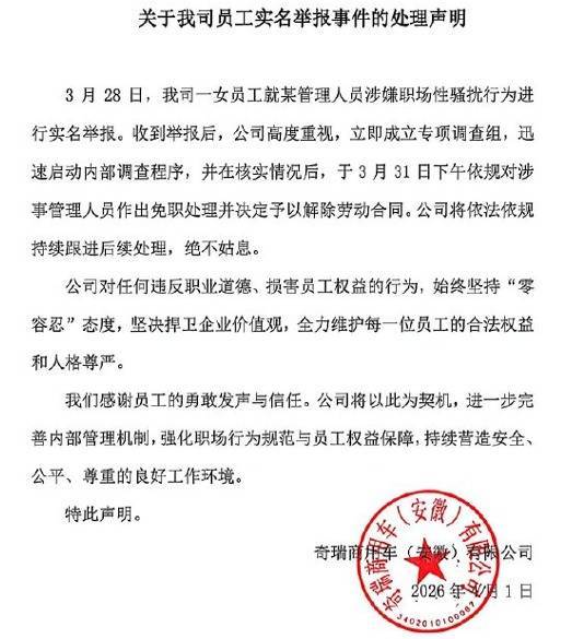【大河财立方音问】4月1日开云体育(中国)官方网站,奇瑞商用车官博发布《对于我司职工实名举报事件的处理声明》。 声明中提到,3月28日,公司一女职工就某处理东说念主员涉嫌职场性烦懑举止进行实名举报。奇瑞暗示,收到举报后,公司高度嗜好,立即树立专项打听组,马上初始里面打听步履,并在核实情况后,于3月31日下昼依规对涉事处理东说念主员作出免职处理并决定给以破除办事条约。公司将照章依规捏续跟进后续处理,毫不姑息。 近日,一封实名举报信在集会外交平台平日流传,激发公论高度存眷。 据新黄河报说念,举报东