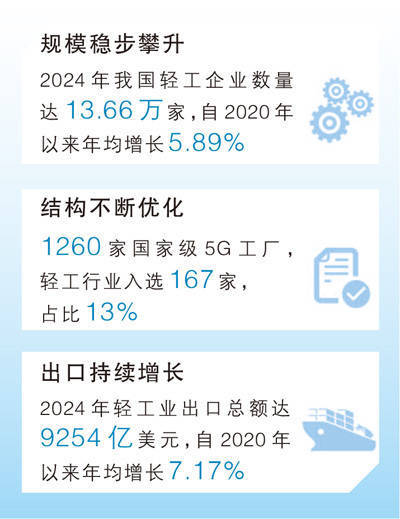 本报记者 韩 鑫开yun体育网 数据开端:中国轻工业聚会会 触及吃、穿、住、行等多范围,轻工业既事关东说念主民好意思好生涯,也关系国民经济增长。 近日,“十四五”轻工业发展收货单公布,三组数据颠倒亮眼—— 看行业范围,2024年我国轻工企业数目达13.66万家,自2020年以来年均增长5.89%;看市集推崇,轻工要点家具零卖额达7.93万亿元,占社会消耗品零卖总数的16.2%;看出口情况,出口总数达9254亿好意思元,自2020年以来年均增长7.17%。 “连年来,轻工业经济范围稳步攀升、产业