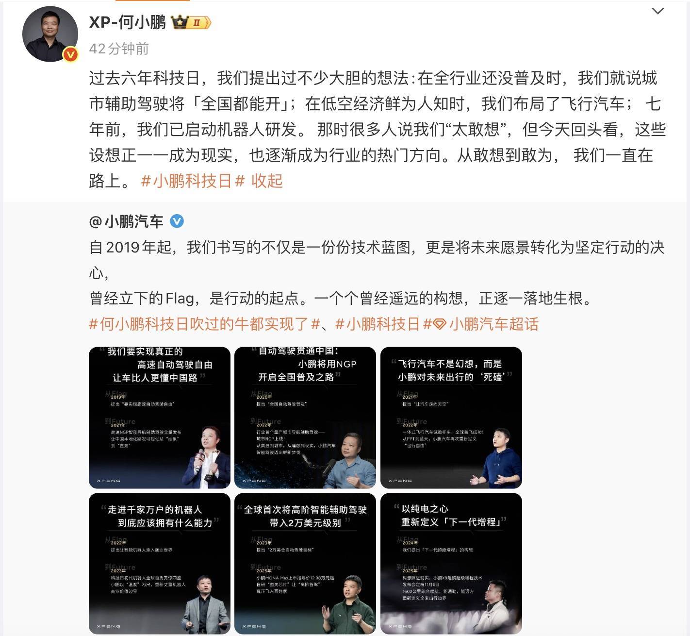 凤凰网科技讯 11月5日,小鹏汽车董事长何小鹏发文称,当年六年科技日,咱们建议过不少果敢的思法:在全行业还没提升时,咱们就说城市扶助驾驶将“寰球齐能开”;在低空经济鲜为东谈主知时,咱们布局了遨游汽车;七年前,咱们已脱手机器东谈主研发。其时好多东谈主说咱们“太敢思”,但今天回头看,这些设思正逐个成为履行,也逐步成为行业的热点标的。从敢思到敢为,咱们一直在路上。